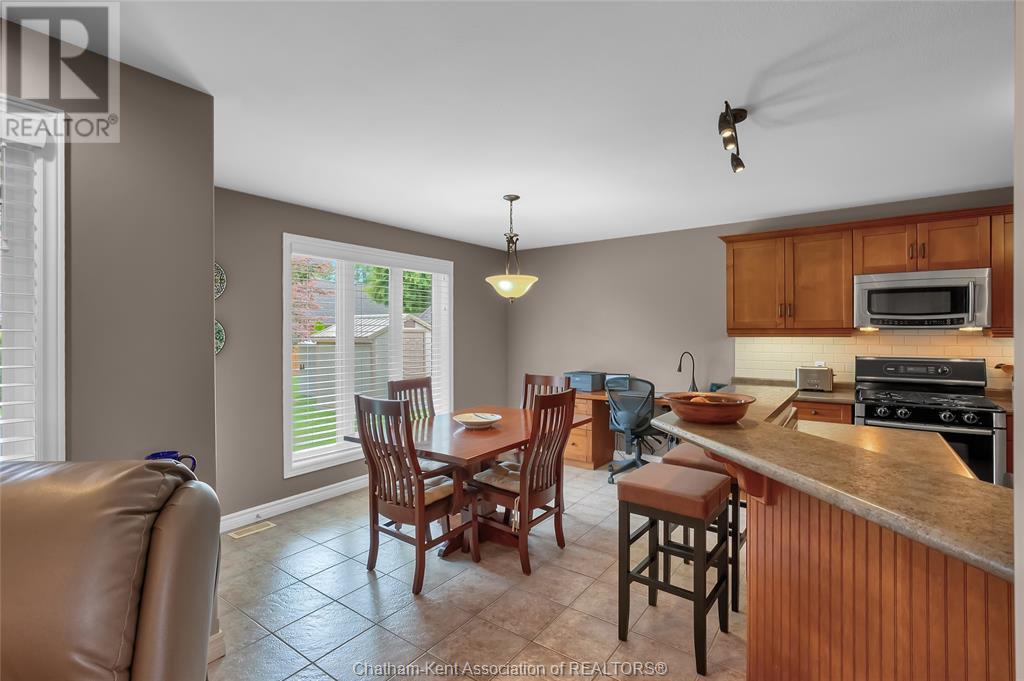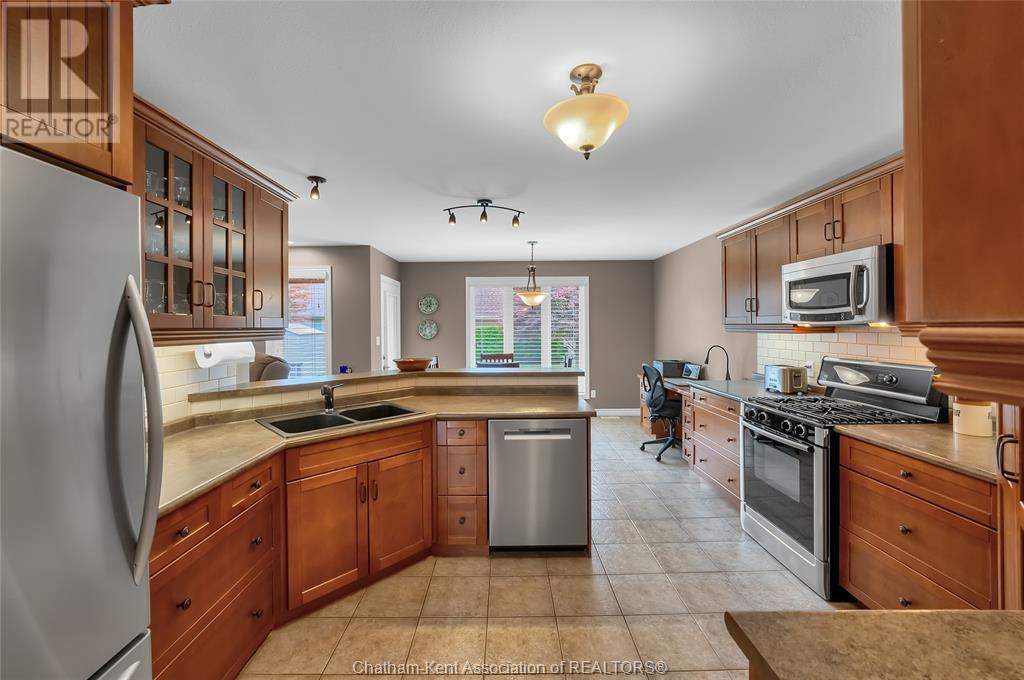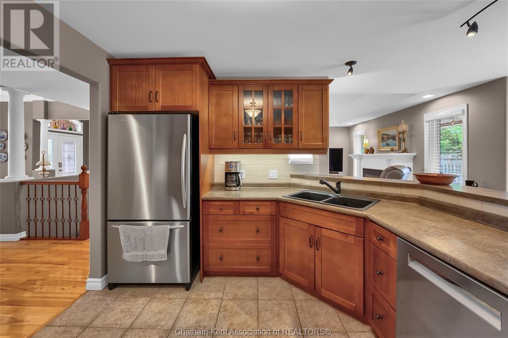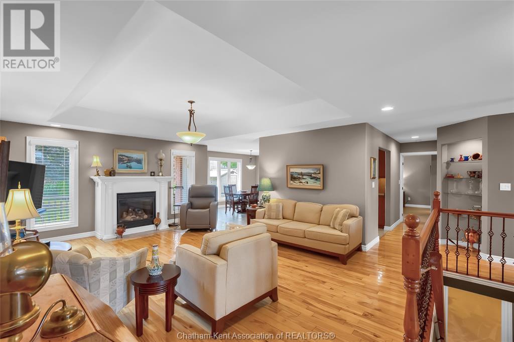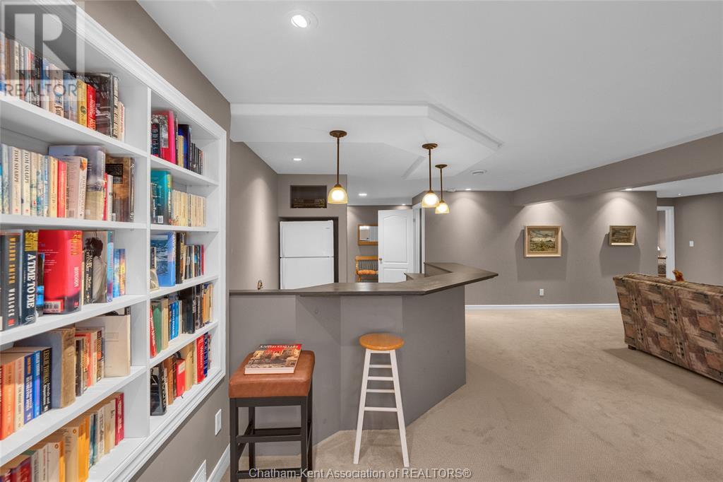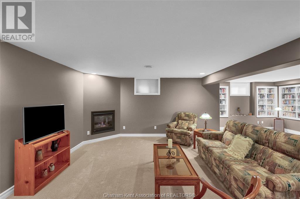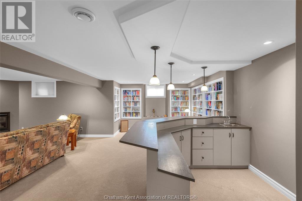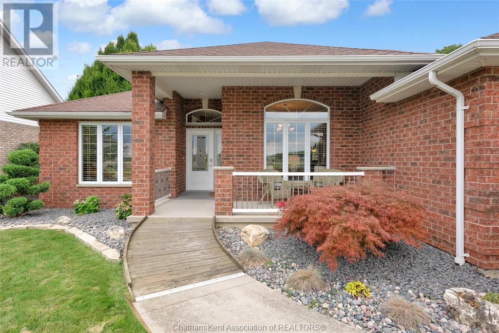 Gorgeous 3+2 bedroom, 3 full bathroom rancher on one of Chatham's most desired streets! Custom built in 2006 by Gilles Michaud. The home features a superb layout centred around a warm and inviting living room with beautiful hardwood maple flooring and a gas fireplace, a large custom kitchen with a peninsula and breakfast nook, and a formal dining room accented by pillars and a picture window for extra natural light. The large primary suite is positioned at the north end of the home with a walk in closet and a full wheelchair accessible bathroom. 2 more good sized bedrooms and another full bathroom are located at the south end of the home. The fully finished basement offers a huge family room with a gas fireplace, built-in library and a wet bar with a fridge, 2 more bedrooms that can be used as a flex space for an office or home gym, tons of storage with a dedicated storage room and several large closets, a 3rd full bathroom, and a laundry/utility room. Systems have been updated with a variable speed gas furnace with central air (2 years), on-demand water heater, whole home surge protection, backup sump pump with an alarm, and the roof shingles are just 8 years old. The yard is kept in tip top condition with an in-ground sprinkler system. The true double garage provides lots of space for two full size vehicles. Appliances are included. Put it all together and you have a high end ranch with a premium location and it's as move-in-ready as it gets! Call now to book your viewing. (id:4555)